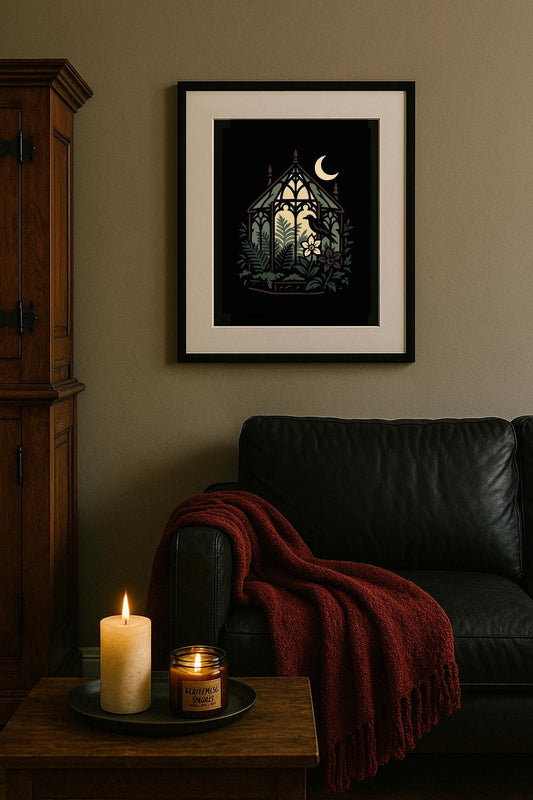 Midnight Conservatory Art Print – Crescent Moon and Vines, Pastel Goth Wall Decor