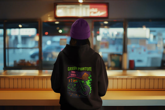 Green Phantom Hoodie – Neon Motorcycle Skull Graphic, Cozy Spooky Halloween Hoodie
