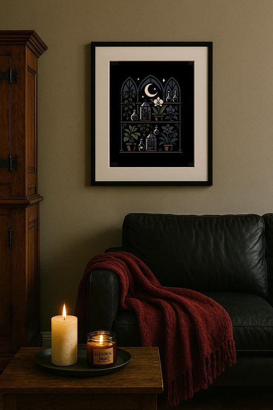Poison Plant Shelves Art Print – Gothic Greenhouse Shelves Poster with Dried Herbs & Moonlight