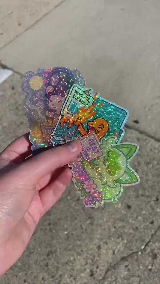 Dreamy Raccoon Rx Bottle Art Print & Vinyl Sticker Duo – Cozy Mental Health Animal Pills – Holographic or Glossy Finish – 4x6 or 8x10 Print.